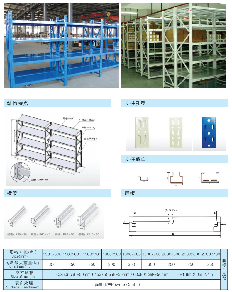 4、立柱設有每60mm調節孔距,可根據貨物高低任意調節。