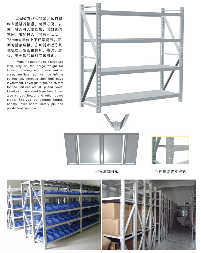 中型貨架,屬于倉儲貨架的一種,擱板貨架類型。是按貨架的承載量來區分與命名的。按照這一劃分原則中型貨架介于輕型貨架和重型貨架之間,故名中型貨架。通常貨架承載150kg/-600kg層(貨架載荷絕大多數是以層為單位的承載量計算)。