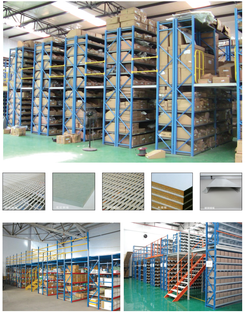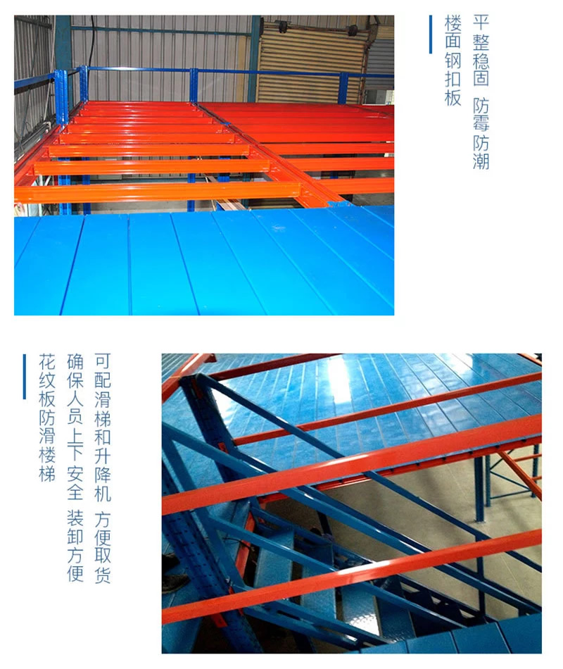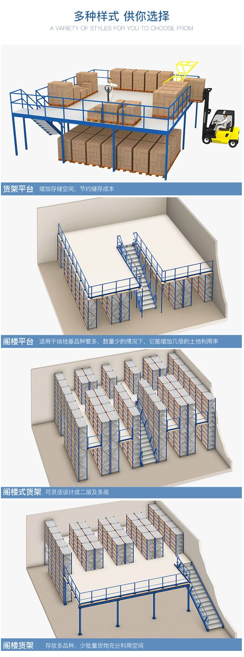 5、下層是貨架形式,上層可以是平臺也可以是貨架的結(jié)構(gòu)。底層貨架既可以存儲物料又是樓面的支撐,極具靈活性。