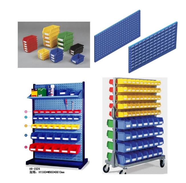 物料整理架物是以方孔掛板和百葉掛板為主要部件,結合背掛零件盒、掛鉤、棚板等多種配件使用。對您生產現場的小型少量多樣的工具、物料進行分類存放、方便搬運歸位、充分利用空間,整潔高效。 物料架用途描述:結合背掛零件盒及多用途的掛鉤配件,不但適合各種類型的物料整理,更適合小型物料、工具、零件及各種異型物品的保管分類,充分有效地利用空間。 掛鉤與方孔掛板配合使用,可任意變換孔位,定位快捷,安全穩固,滿足各類工具的定置管理,節省找尋時間;背掛零件盒與百葉掛板配合使用,吊掛容易,配有色彩標簽,小型物料、零件可利用色彩管理分類儲存。